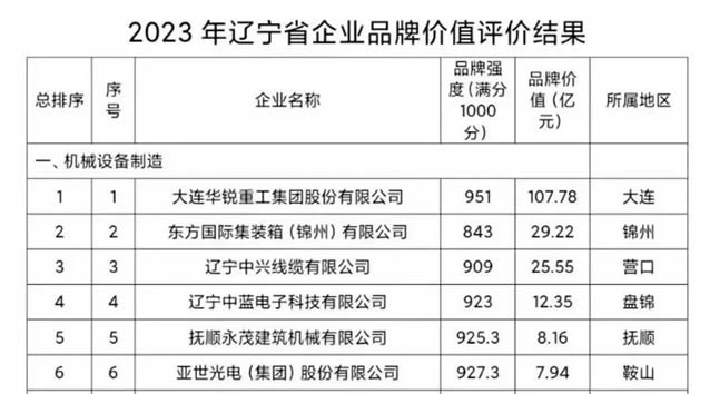 6月8日,遼寧省品牌建設(shè)促進(jìn)會(huì)發(fā)布2022年度遼寧省品牌價(jià)值評(píng)價(jià)信息,評(píng)價(jià)結(jié)果顯示,大連重工裝備集團(tuán)下屬大連華銳重工集團(tuán)股份有限公司(簡(jiǎn)稱“大連重工”)以94.74億元的品牌價(jià)值,居企業(yè)品牌價(jià)值榜第一位。