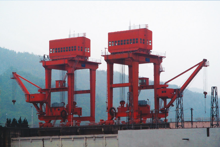 水電站門式起重機是一種門式多功能起重機,主要工作于水電站大壩壩頂或尾平臺,用于發(fā)電機組進水口工作門、排沙底口事故檢修門、攔污柵、泄洪水閘平板工作門等各類閘門的啟閉、搬運,用于機電設(shè)備安裝及壩頂其他設(shè)備的吊運等。大連重工研制的該類產(chǎn)品的主要技術(shù)特點:起重量大(最大1000t)、超載能力強、跨度較小(常為10-20m)、起升高度大、配有自動化或智能化的水下液壓掛梁,可采用各種先進的電氣調(diào)速系統(tǒng)和PLC及網(wǎng)絡(luò)控制系統(tǒng)。