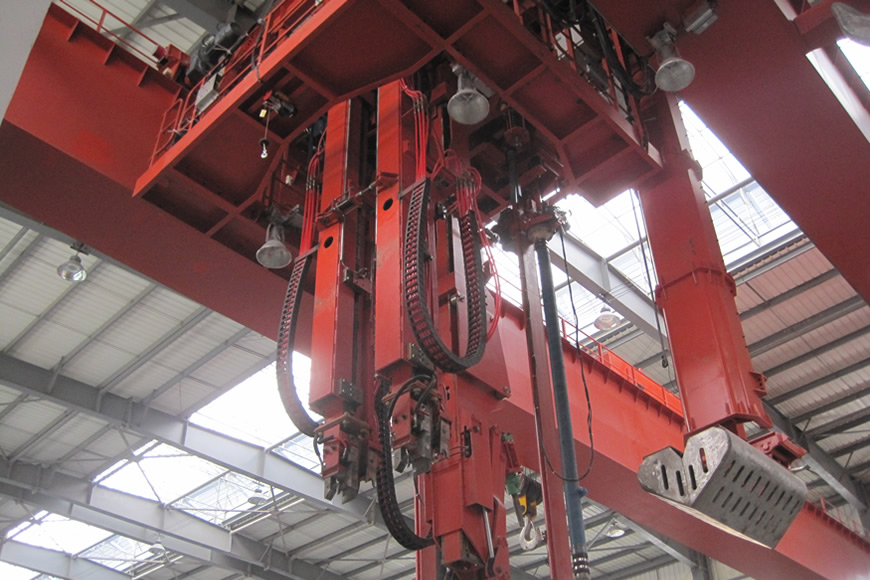 鋼錠夾鉗起重機(jī)是將冷鋼錠裝入均熱爐或?qū)⒓訜嵬瓿傻募t熱鋼錠從爐中取出的起重設(shè)備。大連重工研制的鋼錠夾鉗起重機(jī)規(guī)格包括:20t、40t、45t、60t、65t。